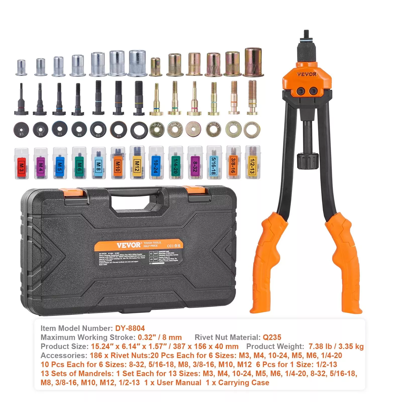 Equipped with 13 mandrel sizes and 186 matching rivet nuts, this kit adapts to almost any task. Replace mandrels quickly without additional tools and switch seamlessly between materials like aluminum, steel, wood, and copper. Whether you’re reinforcing furniture, repairing vehicles, or assembling equipment, this tool ensures strong, dependable fastening every time.