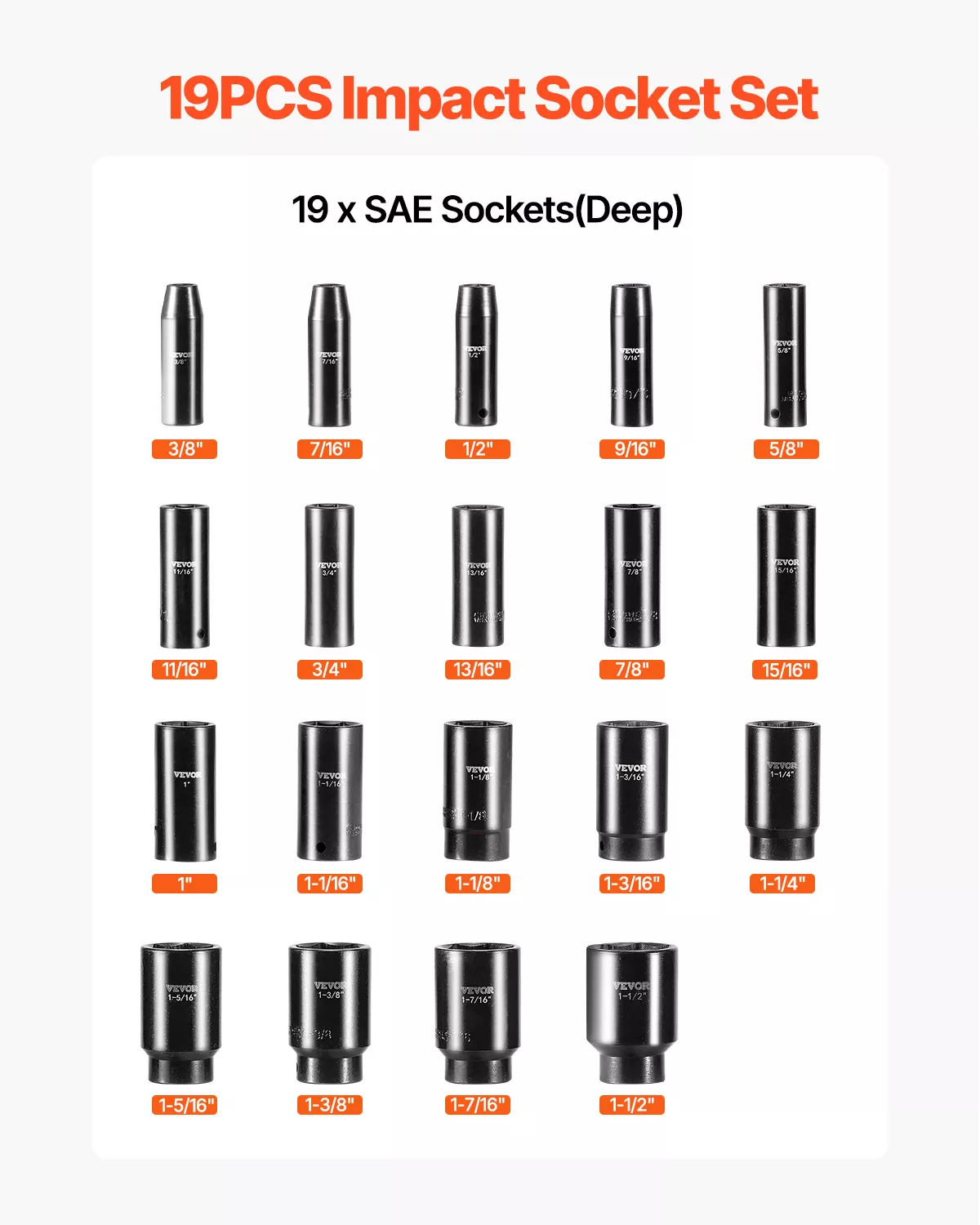 - 19 essential deep sockets from 3/8″ to 1-1/2″ for versatile use