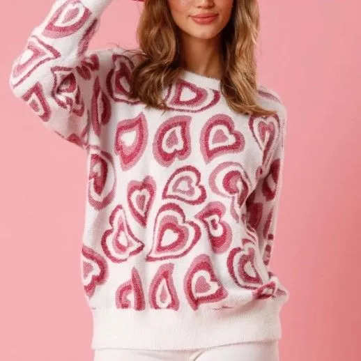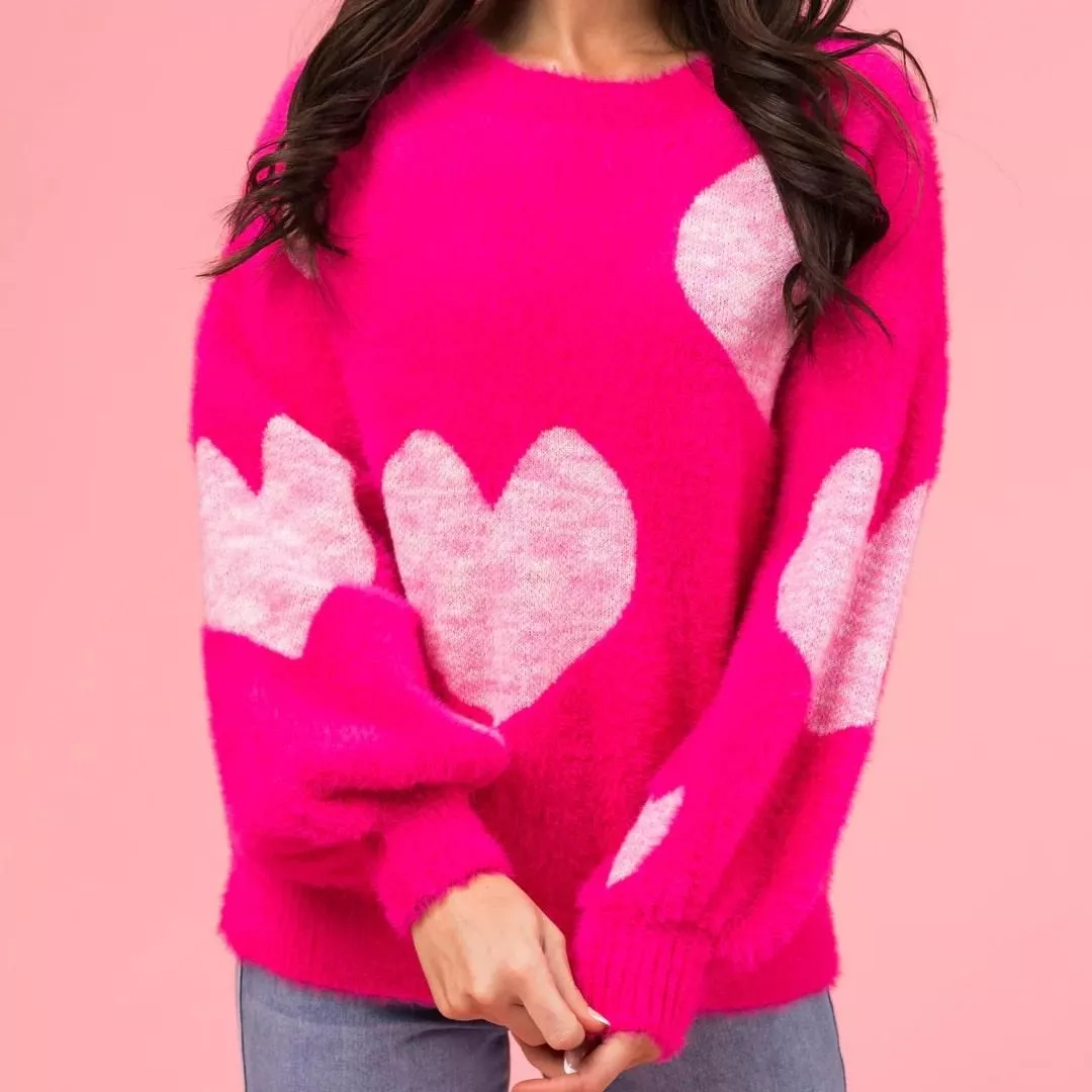 Our sweater stands out for its exquisite combination of comfort, style, and quality. The soft knit fabric provides a cozy feel, while the charming heart print adds a playful touch to your look. With its loose fit and slight stretch, it offers both comfort and versatility, allowing you to move with ease throughout your day.
