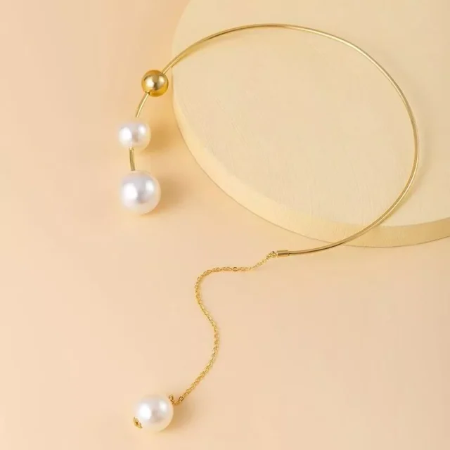 Our set features a unique open collar necklace, beautifully crafted to accentuate the clavicle, paired with charming imitation pearl earrings. The geometric design of the necklace, combined with the timeless beauty of the simulated pearls, creates a look that is both trendy and classic.