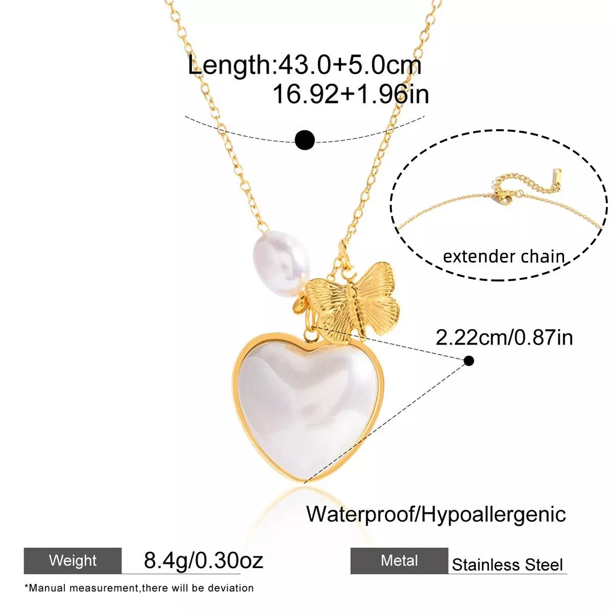 • Design: Heart-shaped pendant adorned with imitation pearls, paired with a beautiful butterfly motif
