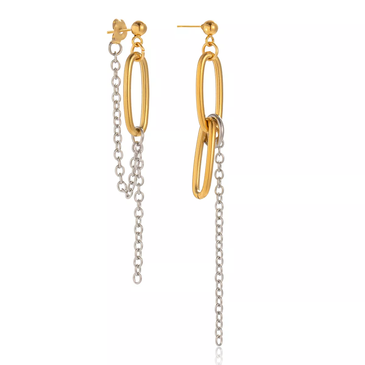 Discover a pair of earrings designed to bring effortless elegance to your daily look. These long chain dangle earrings feature a delicate geometric design that adds a modern touch to any outfit. Crafted from high-quality stainless steel and finished in a radiant gold tone, they offer a sleek blend of durability and sophistication. With their lightweight feel and fashion-forward shape, they are perfect for women who love timeless style with a trendy twist.