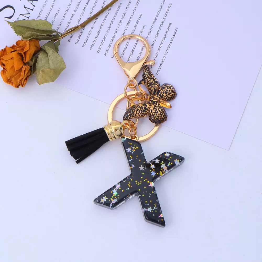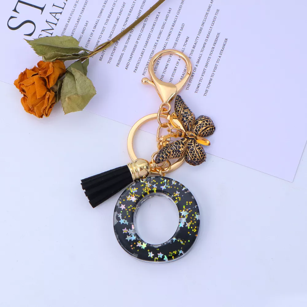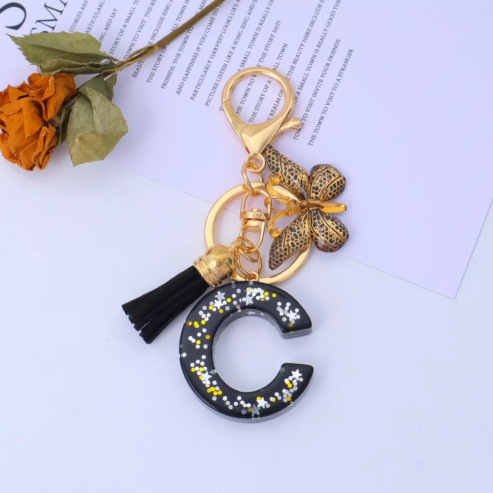 Gold Initial Sequin Star Keychain with Tassel Bag Charm