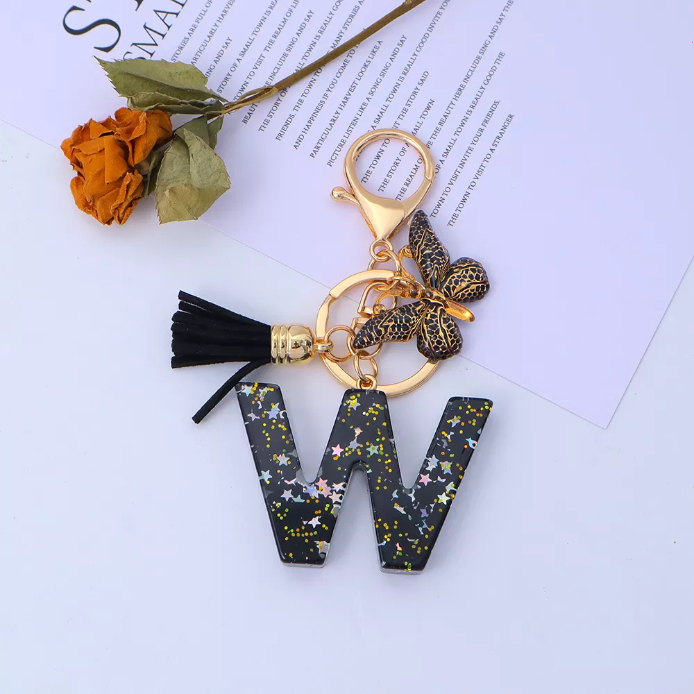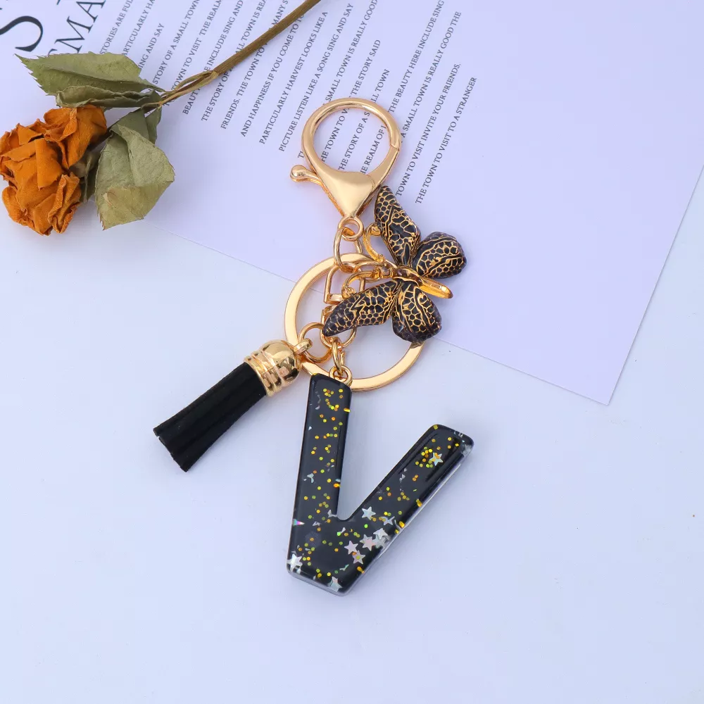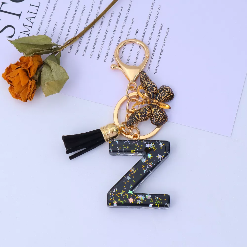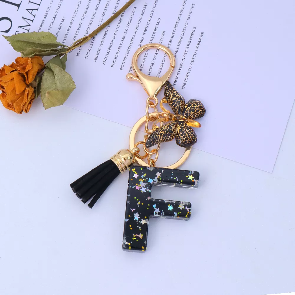 Gold Initial Sequin Star Keychain with Tassel Bag Charm