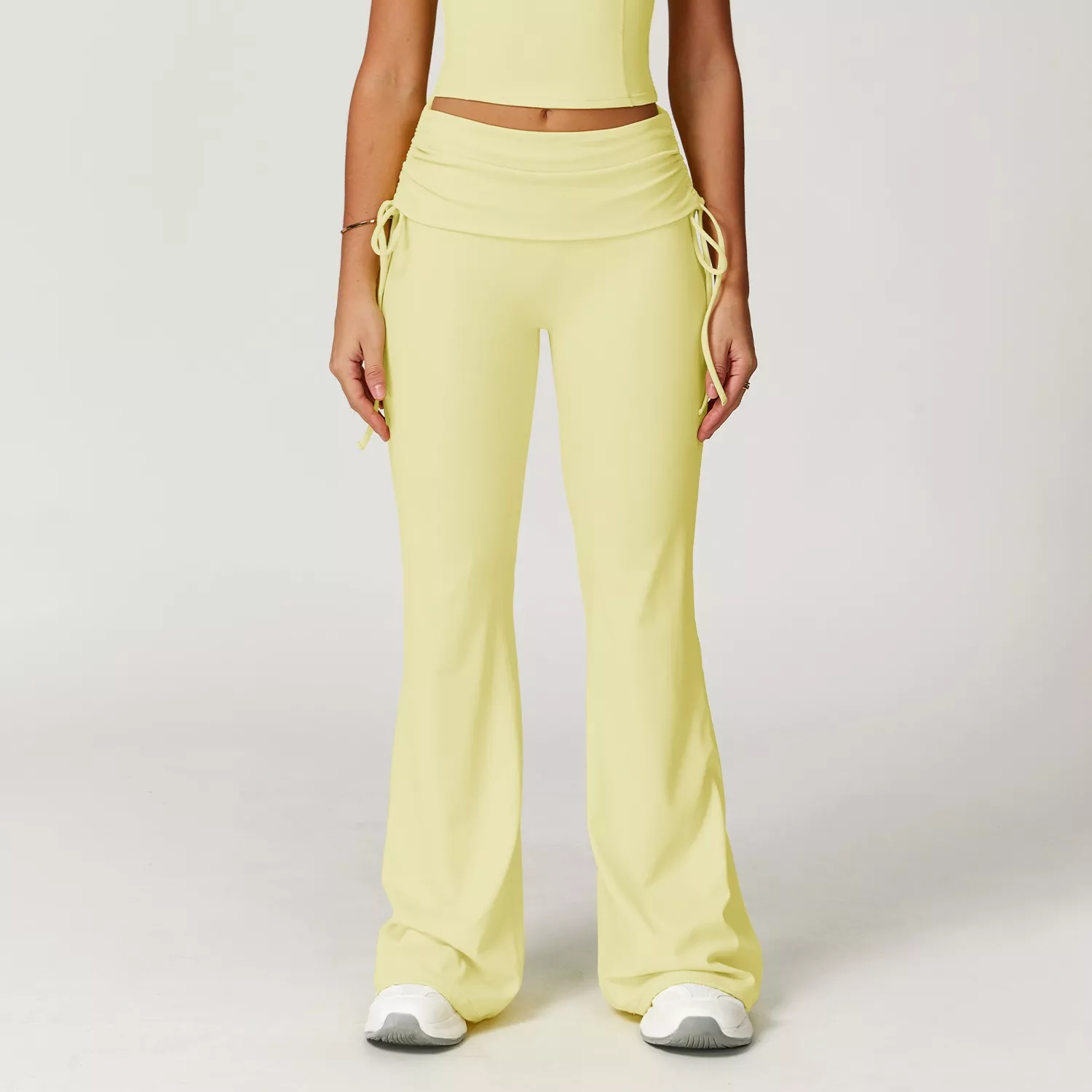 Perfect for year-round wear, these leggings are available in a variety of colors including Black, Sky Blue, Brown, Pink, and Yellow, allowing you to express your personal style. The flared legs add a touch of vintage flair, making them not only practical but fashionable as well. The moisture-wicking fabric keeps sweat at bay, allowing you to feel fresh and comfortable no matter how intense your workout gets.