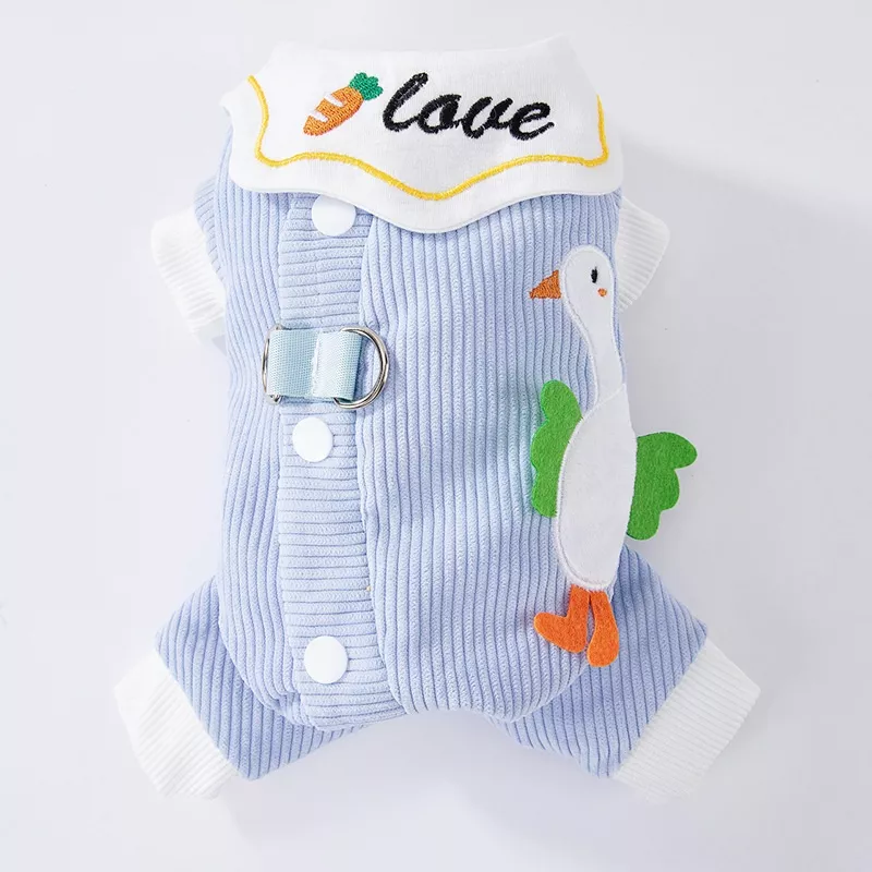 Made from soft, breathable polyester, the jumpsuit gently hugs your pet’s body without restricting movement. It features an adorable animal pattern available in Blue or Yellow and fits naturally without touching or blocking your pet’s fur. Thoughtfully crafted with exquisite workmanship, it offers a simple yet aesthetically pleasing look your pet will love wearing.
